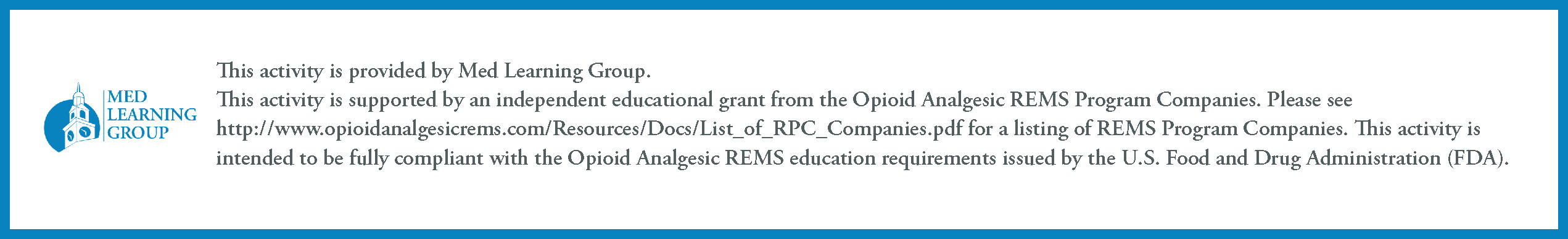 Consistent with the goals of the FDA REMS blueprint, this REMS-compliant continuing education program is designed to meet the educational needs of a broad range of healthcare professionals, nationally, including medication prescribers and care team members; physicians (including primary care, internal medicine, emergency medicine, surgery, pain medicine, addiction medicine), advanced practice nurses (eg, APRN, CNS, NP, DNP, CRNA, CNMW, other), physician assistants, dentists, podiatrists, nurses, pharmacists, optometrists, and psychologists.